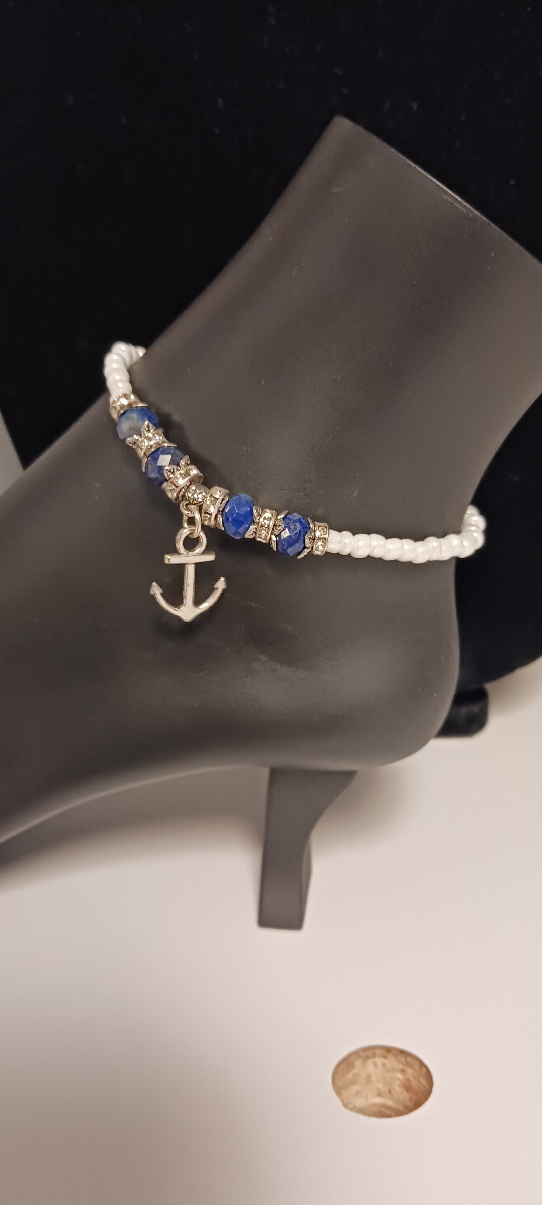No clasps, it's stretchy and indestructable. Each one is a one of a kind and handcrafted anklet with etched faceted stone beads and a ship/boat anchor charm. All beads are all ceramic, stone and glass. Approximately 8".