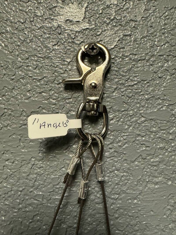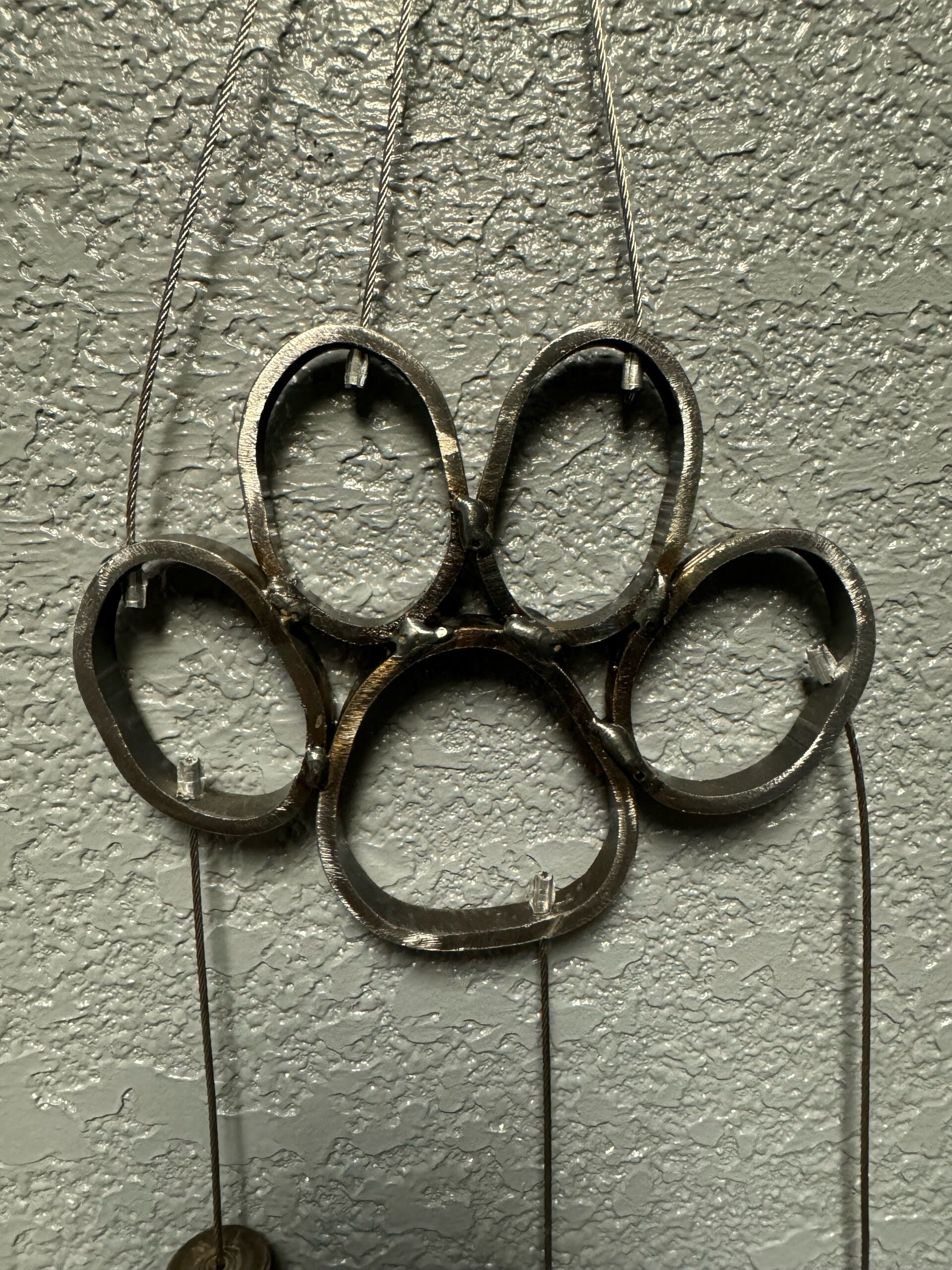 Handcrafted metal art windchimes hancrafted by Dave's Arts Parts, "Angels." This product consists of Steel welded into the shape of a dog paw, 50 calibur shells, copper tubing, cable and sheet metal.