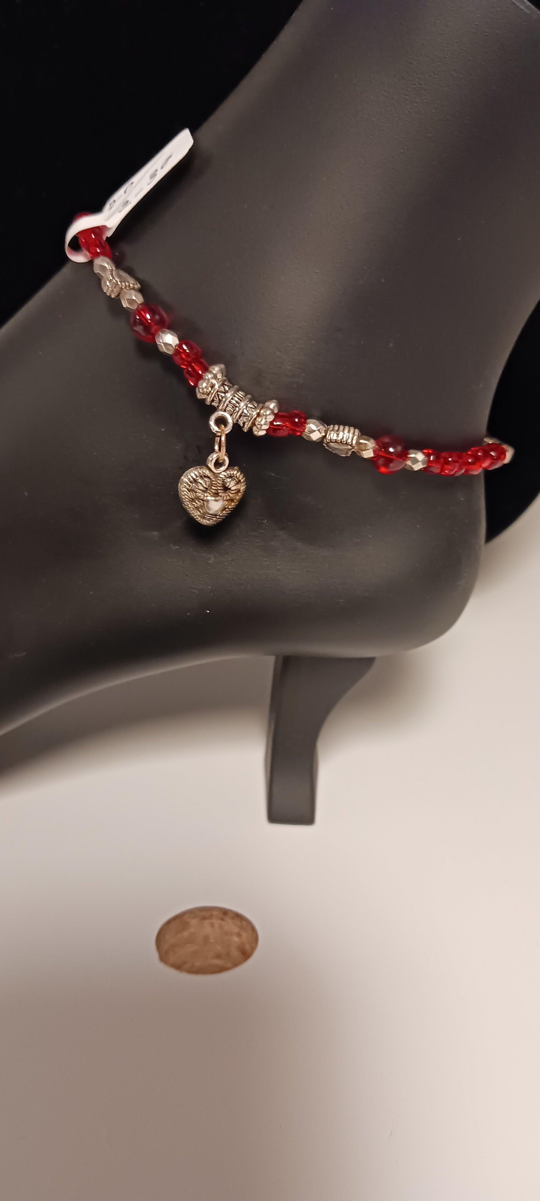 Fire red beaded anklet with scroll heart charm. Approximately 8"
