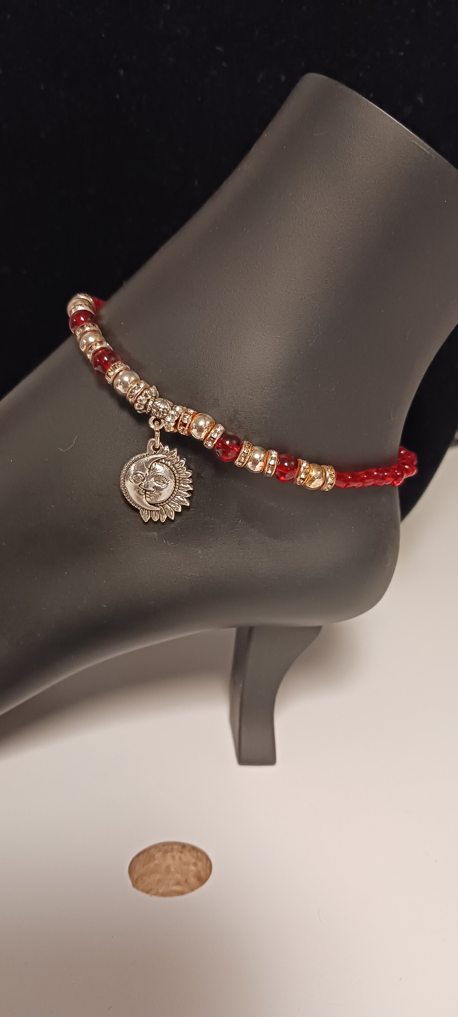 Fire Red beaded anklet with Sun and Moon charm. Approximately 8"