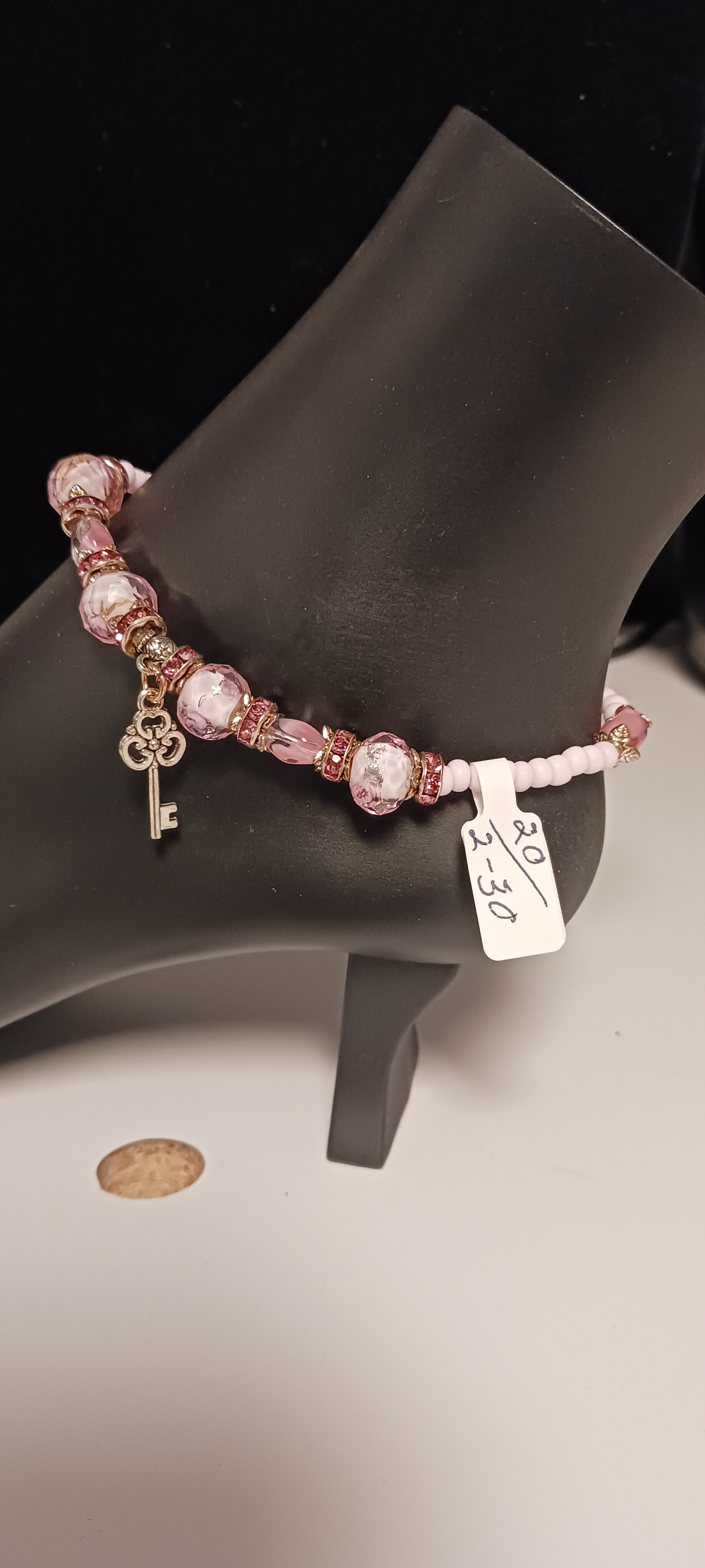 Handcrafted pretty in pink beaded anklet with key charm. Approximately 9"