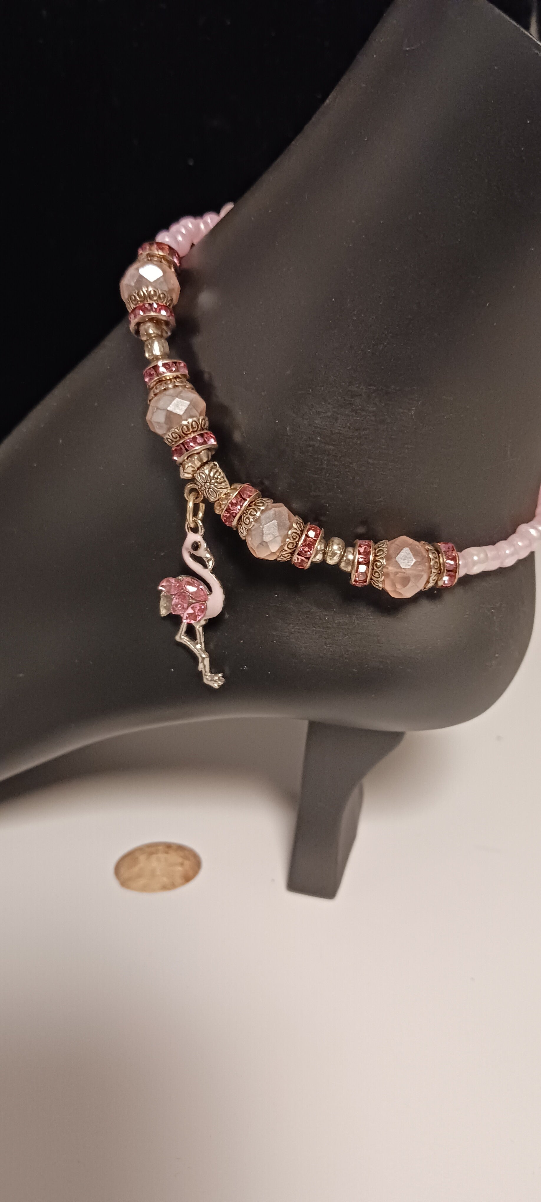 Handcrafted pretty in pink beaded anklet with flamingo gem charm. Approximately 9"