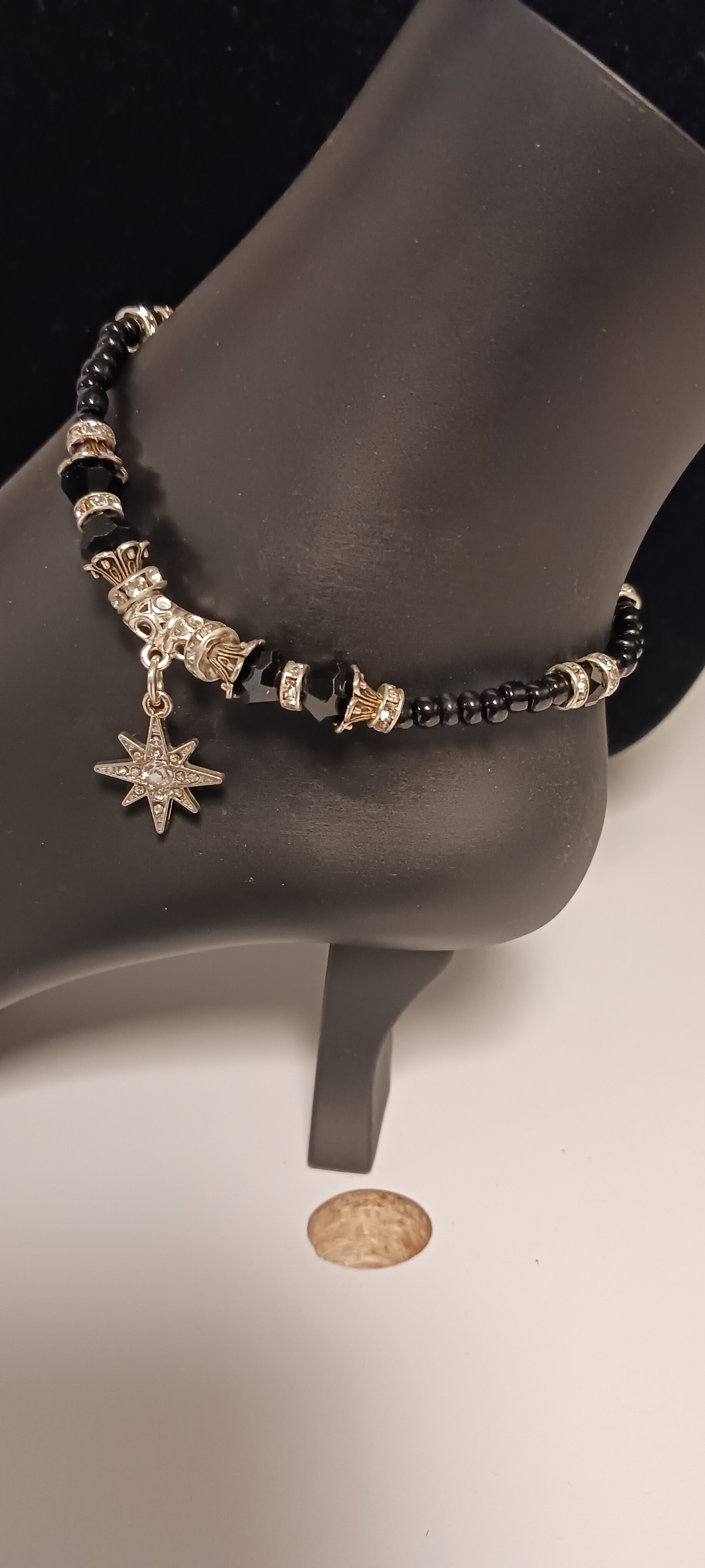 No clasps, it's stretchy and indestructable. Each one is a one of a kind and handcrafted anklet with faceted glass beads and a sunburst charm. All beads are all ceramic and glass. Approximately 8".