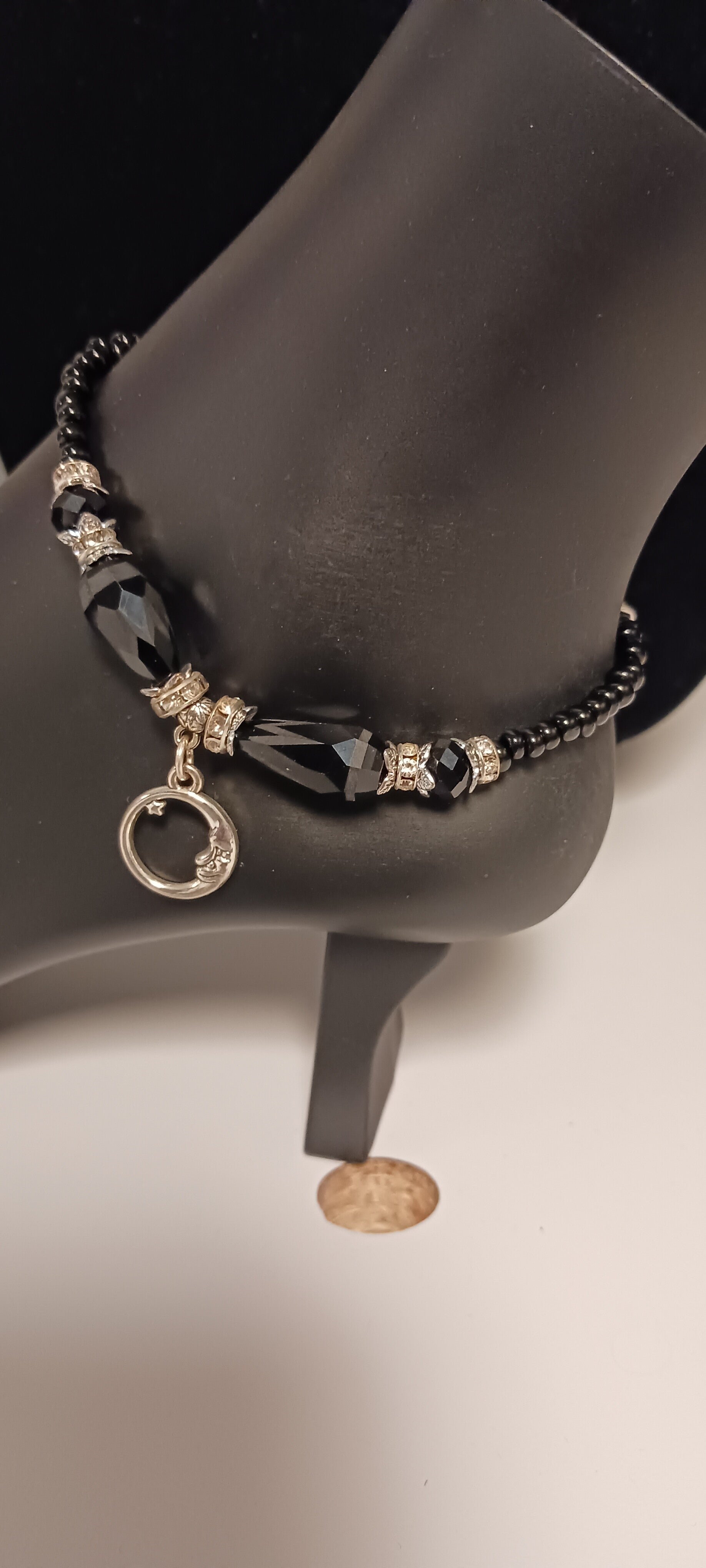 No clasps, it's stretchy and indestructable. Each one is a one of a kind and handcrafted anklet with etched faceted beads and a moon and star charm. All beads are all ceramic and glass. Approximately 8".